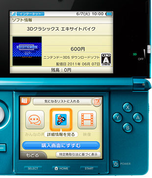 Además, para celebrar la llegada de la tienda Nintendo eShop, la empresa ofrecerá a todos los que actualicen su Nintendo 3DS hasta el 7 de julio el juego clásico de la Nintendo Entertainment System (NES) Excitebike™, ahora en 3D y de forma gratuita. Otros nuevos contenidos que estarán disponibles gracias a Nintendo eShop son títulos de la Game Boy™ en la consola virtual como Super Mario Land™, Alleway™ y Tennis™. Nintendo eShop se actualizará con nuevos contenidos cada jueves.