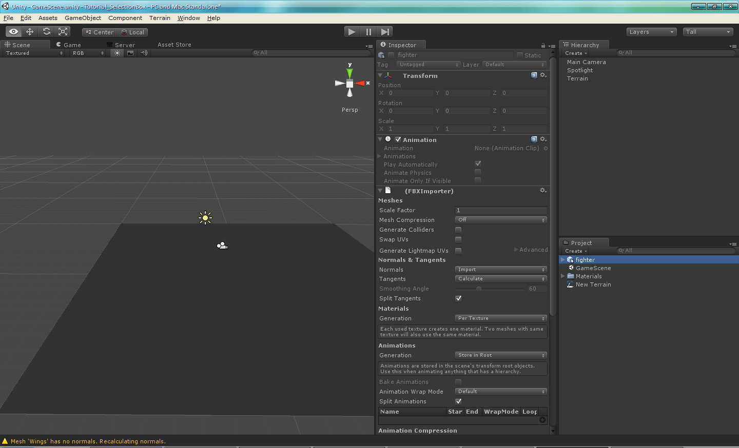 Como tenemos que acostumbrarnos a tener una meteodología ordenada, vamos a crearnos una carpeta llamada «Resources», y dentro de ésta otra llamada «Fighter» donde guardaremos los Assets importados: el modelo «fighter.obj» y una carpeta llamada «Materials», donde podremos configurar el material del modelo, esto es texturizado y otros shaders.