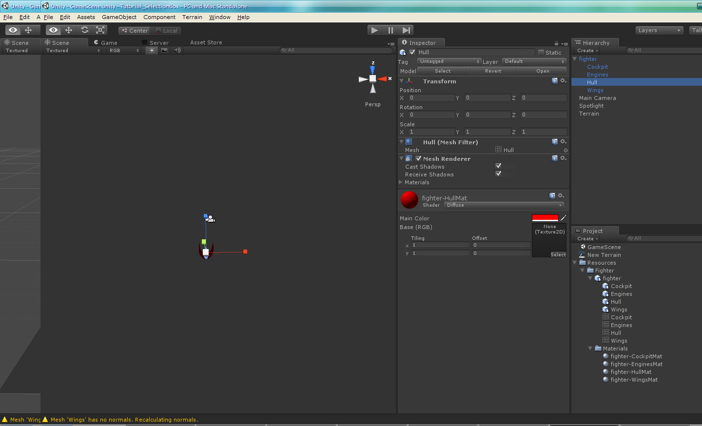 Para verlo mejor, he ido seleccionando cada uno de los componentes de «fighter» y le he puesto el Main Color en rojo. Lo suyo sería tener alguna textura currada para arrastrarla a donde pone «None (Texture 2D)», pero bastante que estamos utilizando un modelo 3D, porque en un principio iba a recurrir al típico cubo.
