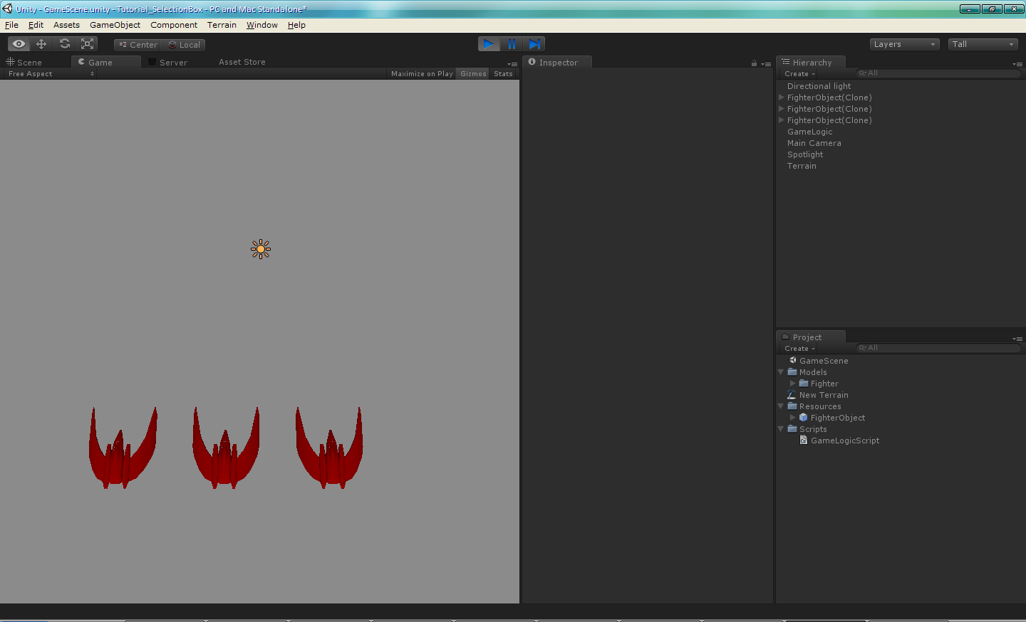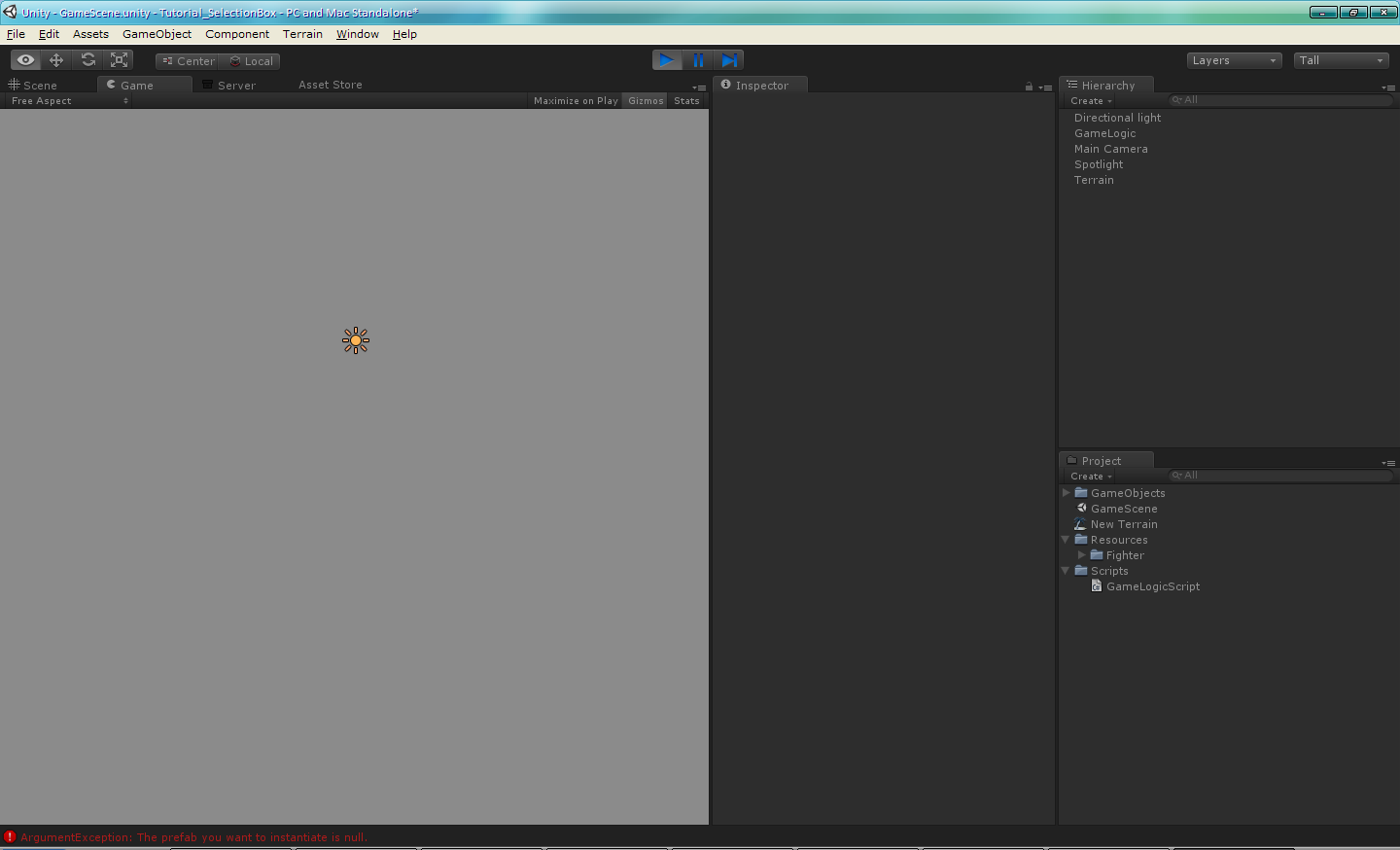 Vamos a comprobar que nuestro proyecto funciona. Esto es algo que tenemos que acostumbrarnos a hacer a menudo. Le damos al Play y… ¡tachán! Nos peta. Si habéis seguido mis pasos deberíais ver el error «ArgumentException: The prefab you want to instantiate is null.» en vuestra Console, y por supuesto, no han aparecido los cazas.