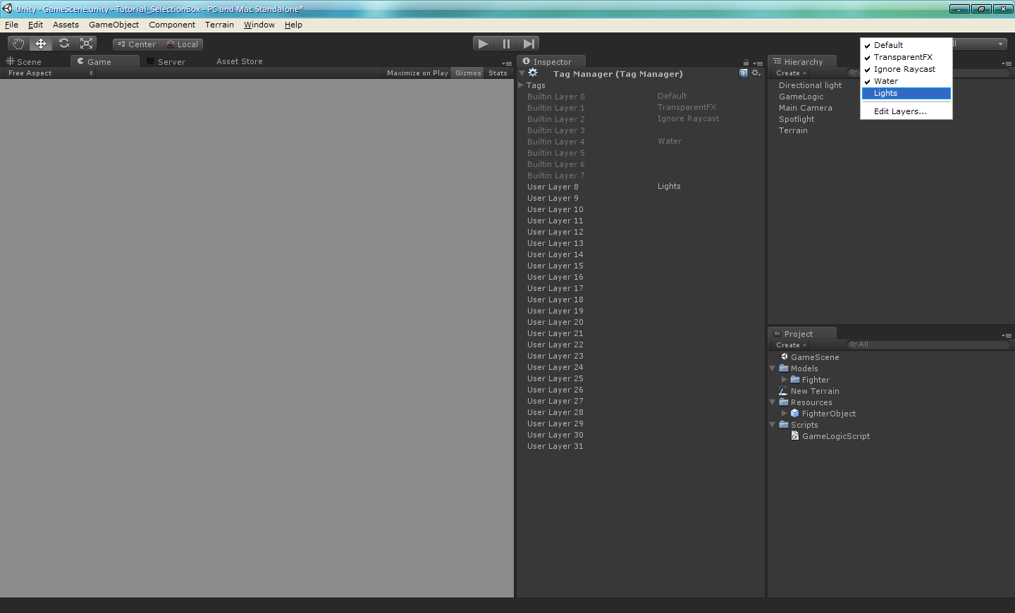 Le damos de nuevo al icono del Play para detener la ejecución (recordemos que los cambios que hagamos mientras está lanzado el juego no se quedan guardados una vez lo paremos) y en el Inspector del «Directional light», vamos a hacer click sobre el menú desplegable de «Layer -> Add Layer…». Comprobamos que las 7 primeras están reservadas por la aplicación. En el 8, vamos a haer click a la derecha para crear una capa que llamaremos «Lights». Volvemos a hacer click en el «Directional light» y vemos que ahora podemos elegir «Layer -> Lights». Vamos a seleccionar el «Spotlight» y vamos a meterlo también en «Layer -> Lights».
